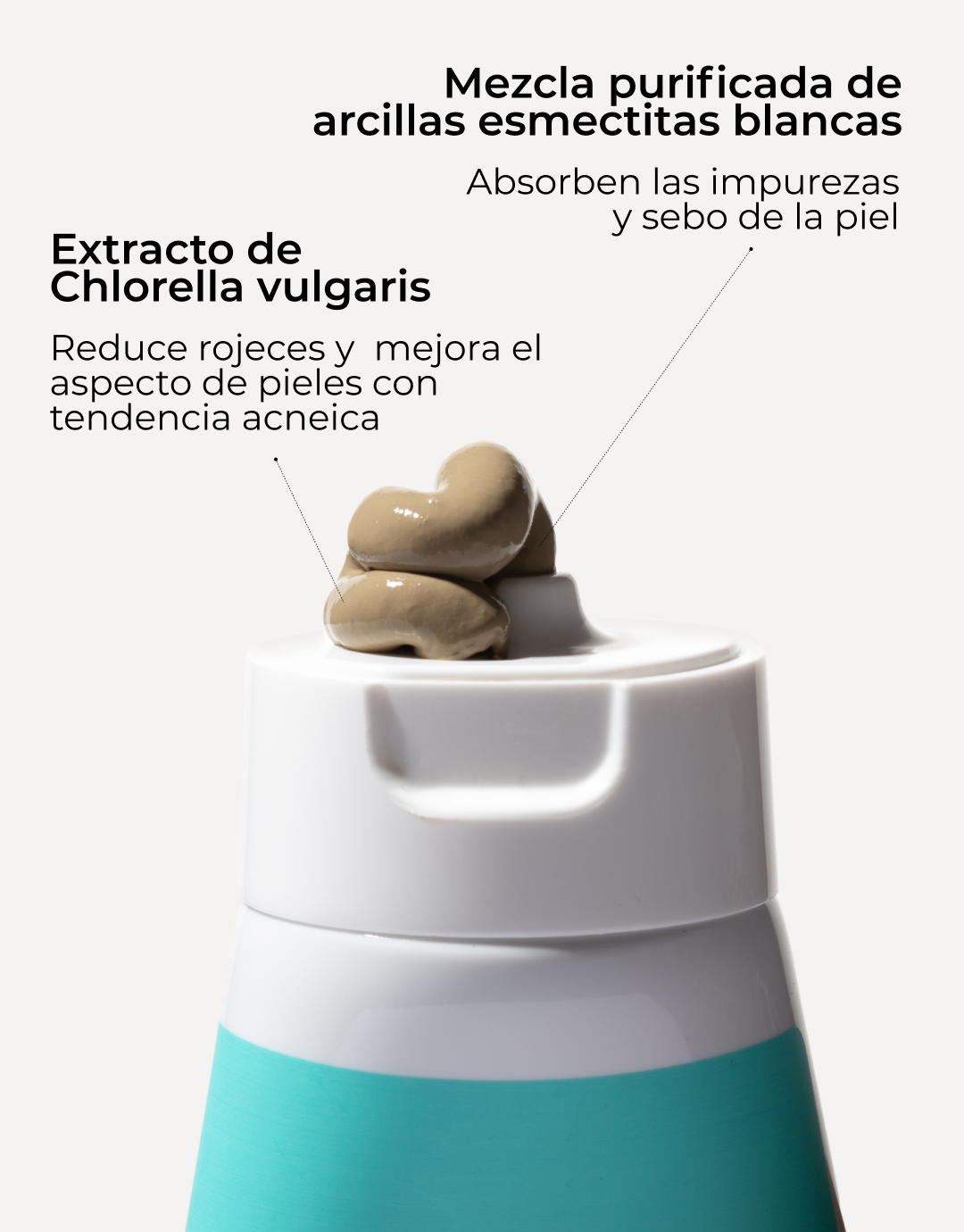 - Mezcla altamente purificada y seleccionada de arcillas esmectitas blancas. Absorben las impurezas y sebo de la piel e intercambia los minerales beneficiosos de la arcilla.